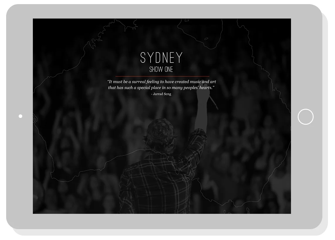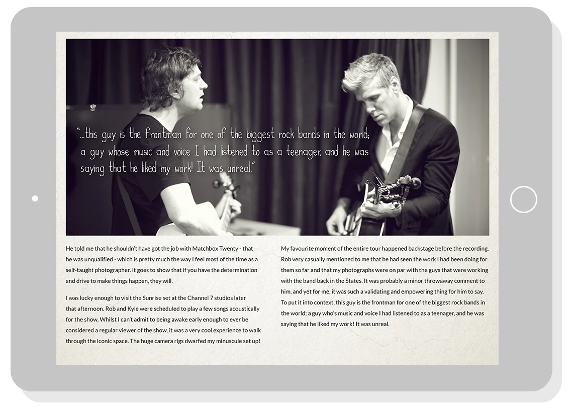 One of Matchbox Twenty's favorite places to tour, is Australia. They held a contest where a photographer would be able to follow them on their journey across Australia and document the experience. This winner as named Jarrad Seng, and his photos were used to create an Apple iBook of the shows with a chapter of his story of the experience. Each chapter has interactive elements