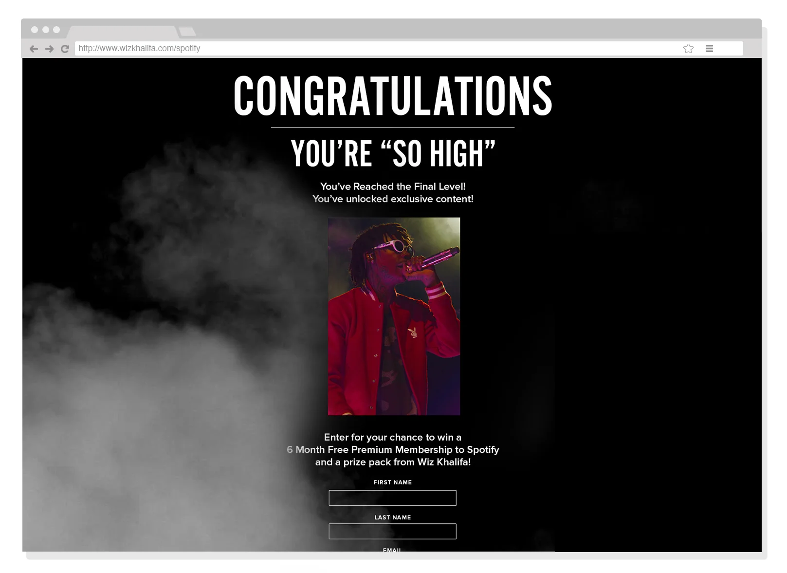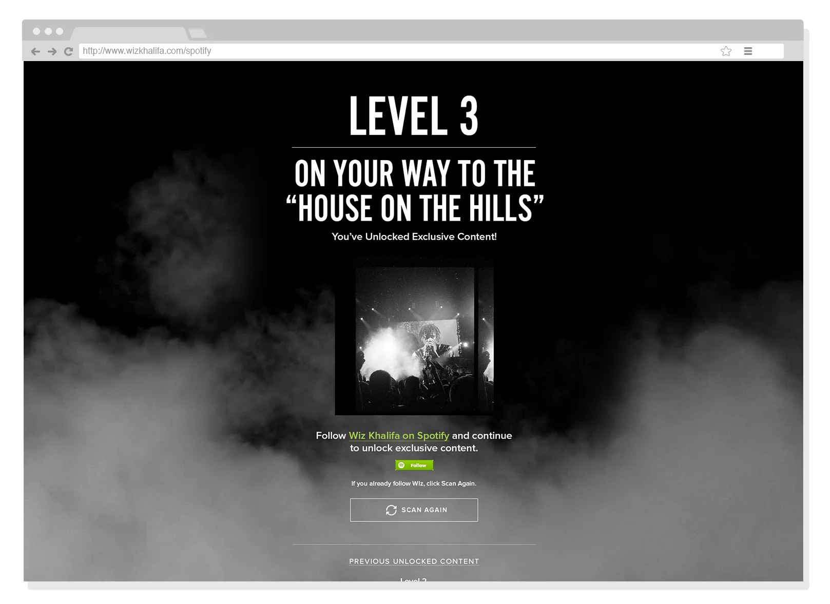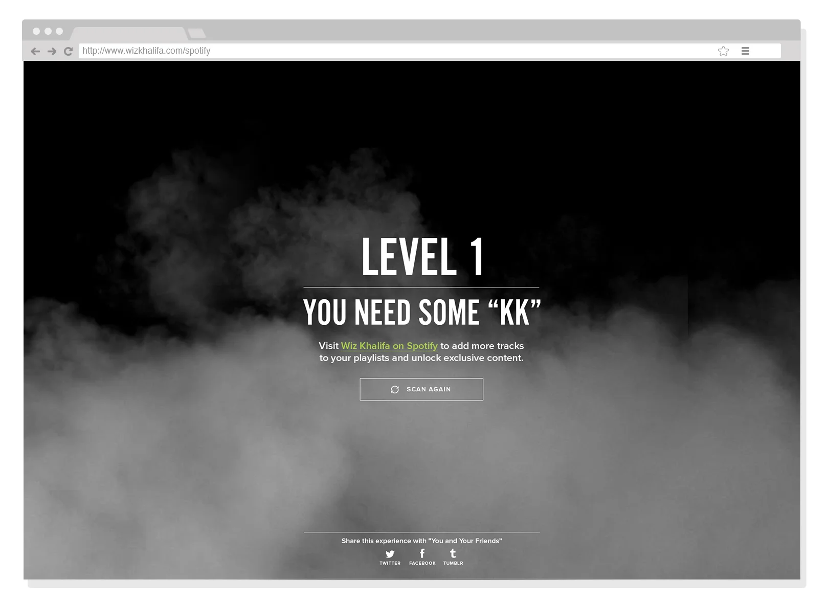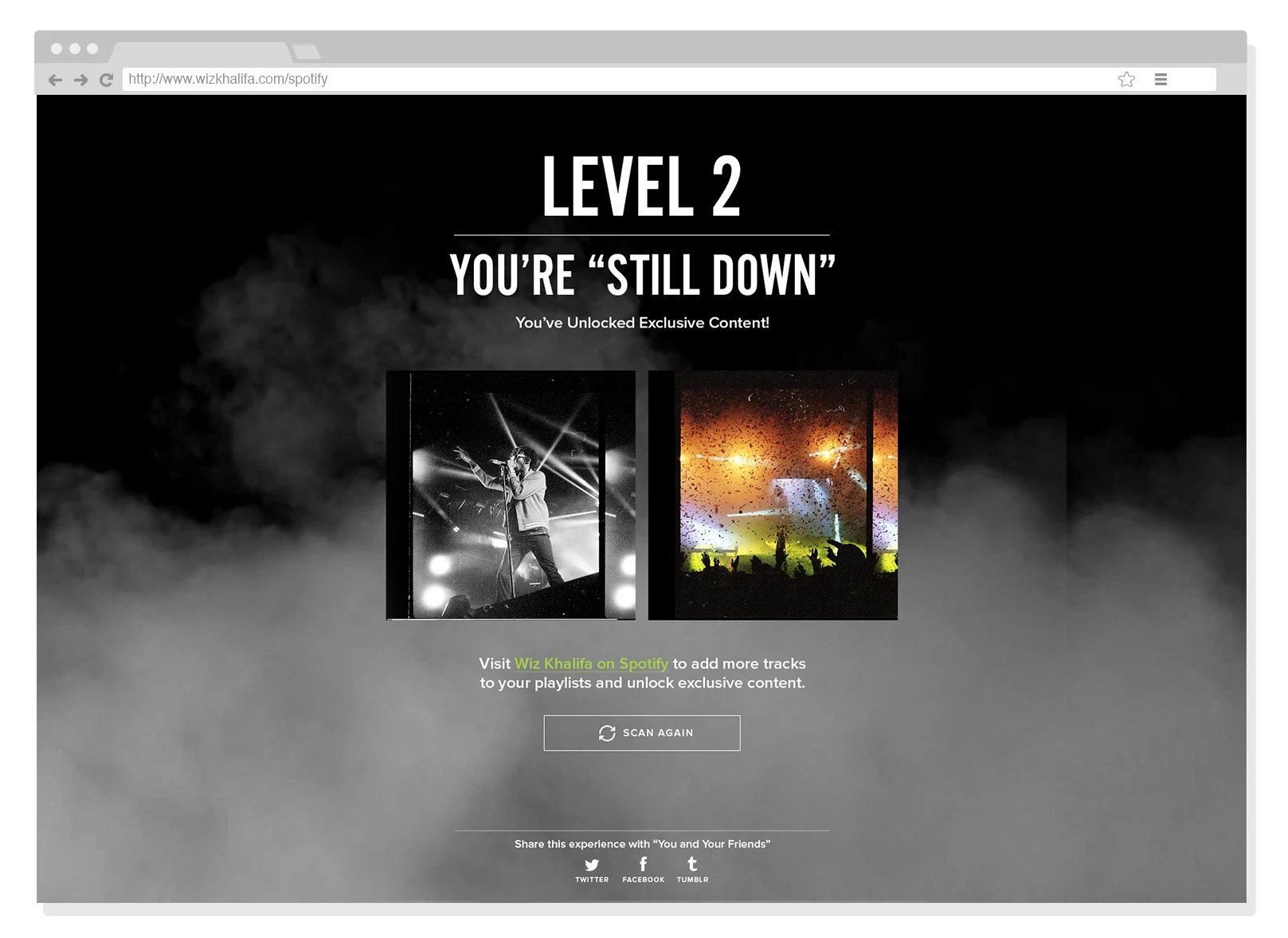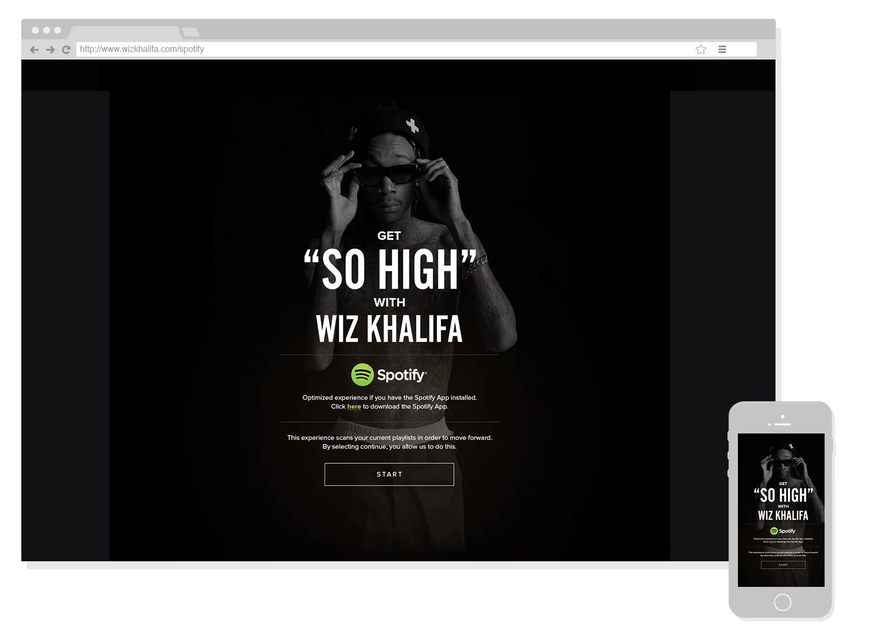 The first artist experience via the Spotify API. Each fan logs into Spotify and the API determines how many Wiz Khalifa songs are in your playlists.